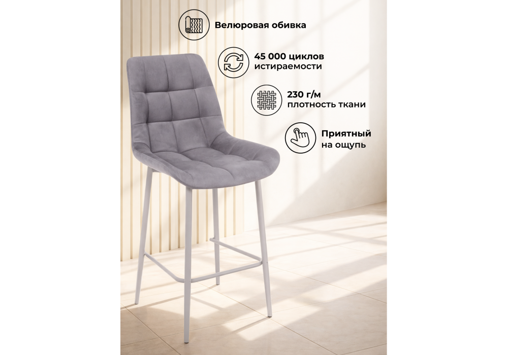 Материал каркаса - металл; Материал сиденья - велюр; Материал обивки - велюр; Цвет ножек - серый; Ширина - 50; Глубина - 58; Высота - 99; Ширина сиденья - 46; Глубина сиденья - 41; Высота сиденья - 63;