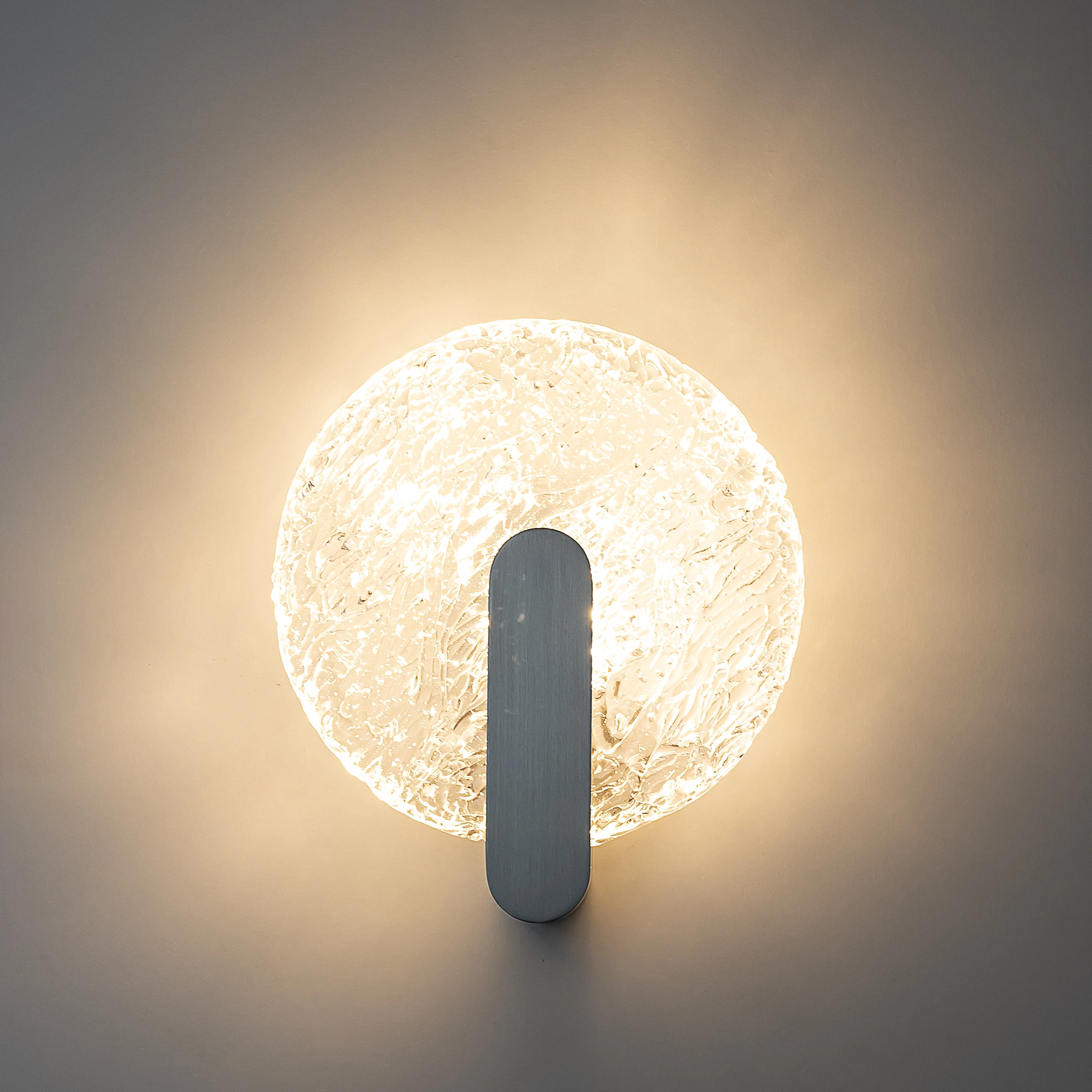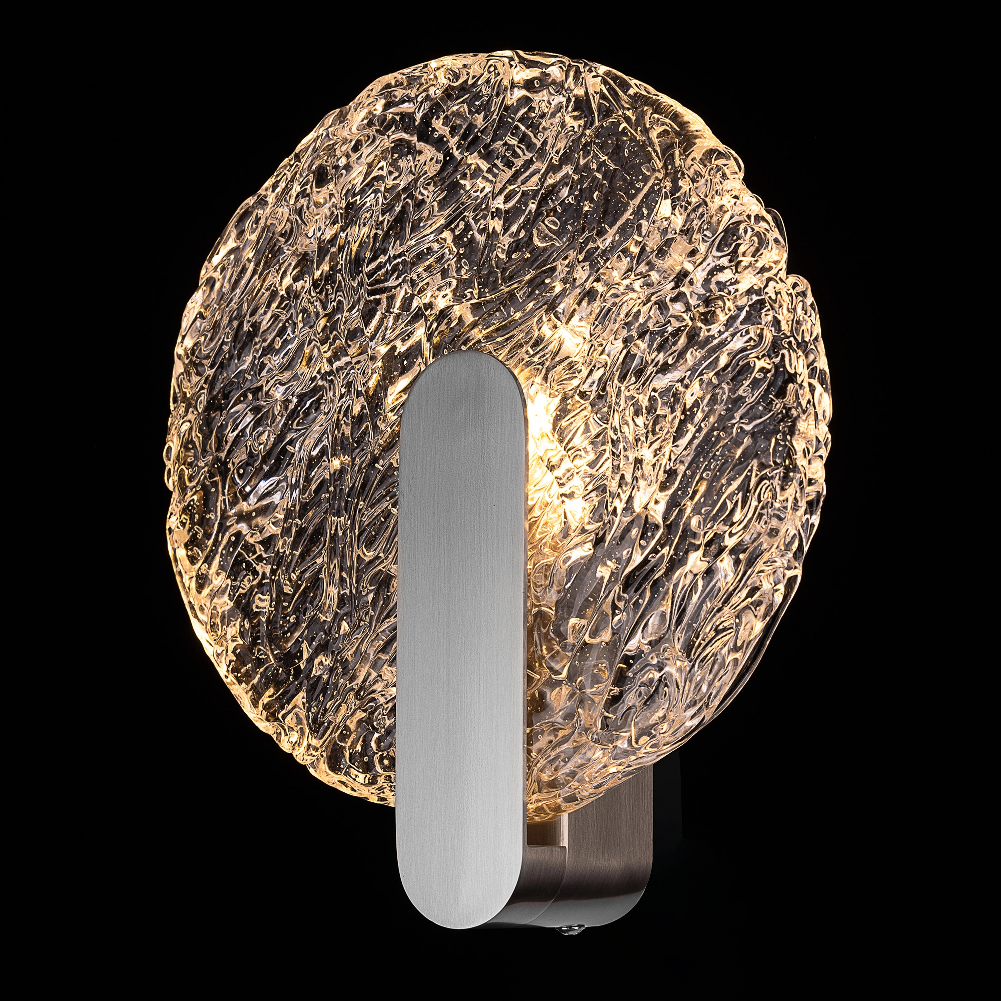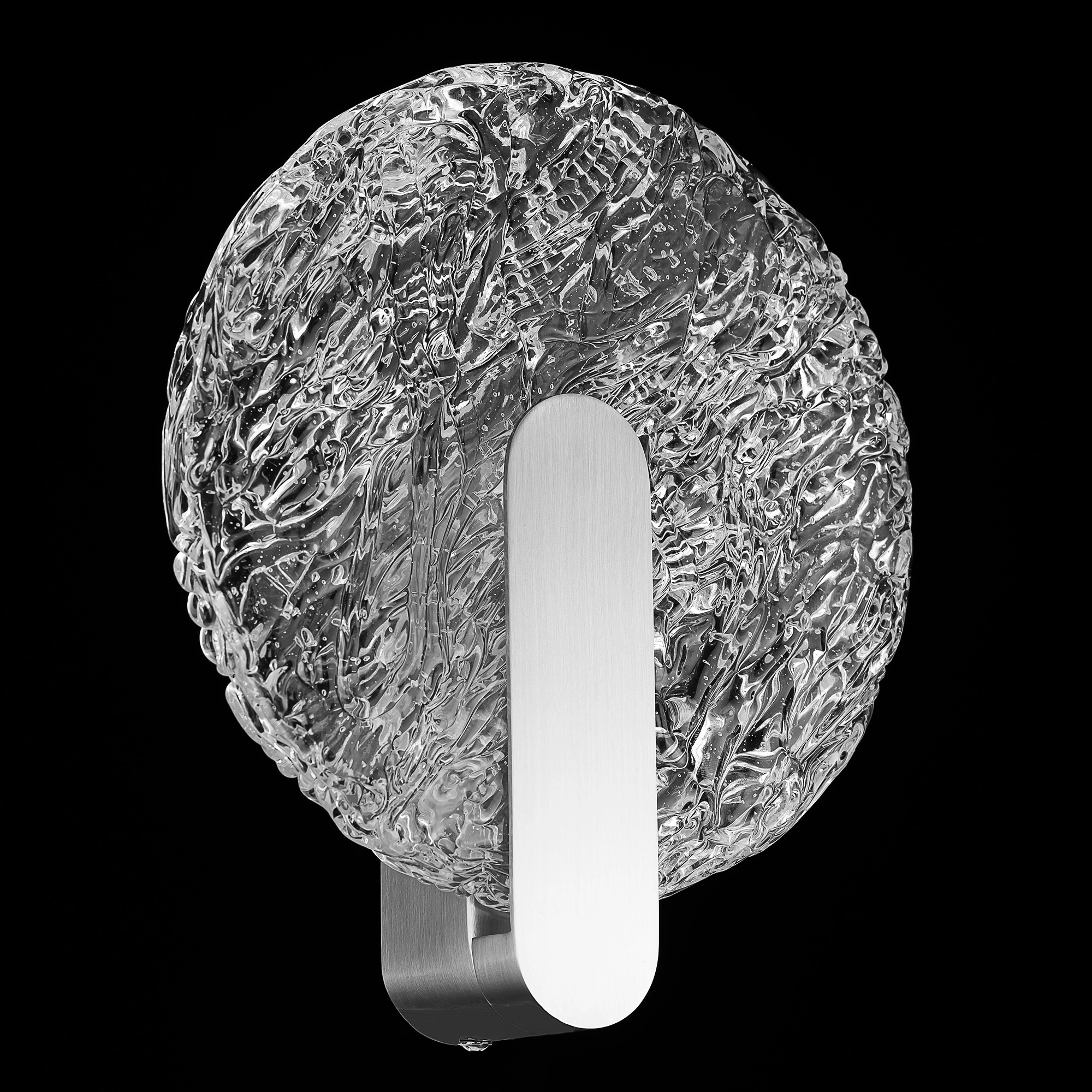 Благодаря элегантному металлическому корпусу оттенка матовый хром светильник выглядит практически незаметным в интерьере. Плафон круглой формы, из стекла с причудливой текстурой, будто «вязаной». Встроенные светодиоды обеспечивают равномерное распределение света, без мерцания и пульсаций. Мощность бра составляет 5Вт, цветовая температура — 3000К, что соответствует теплому освещению.