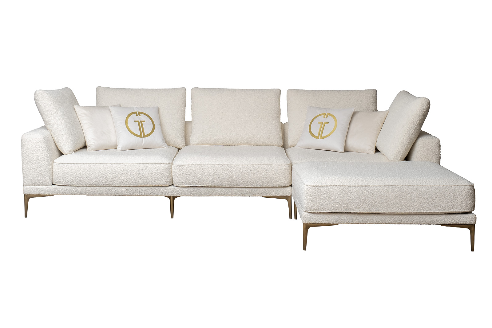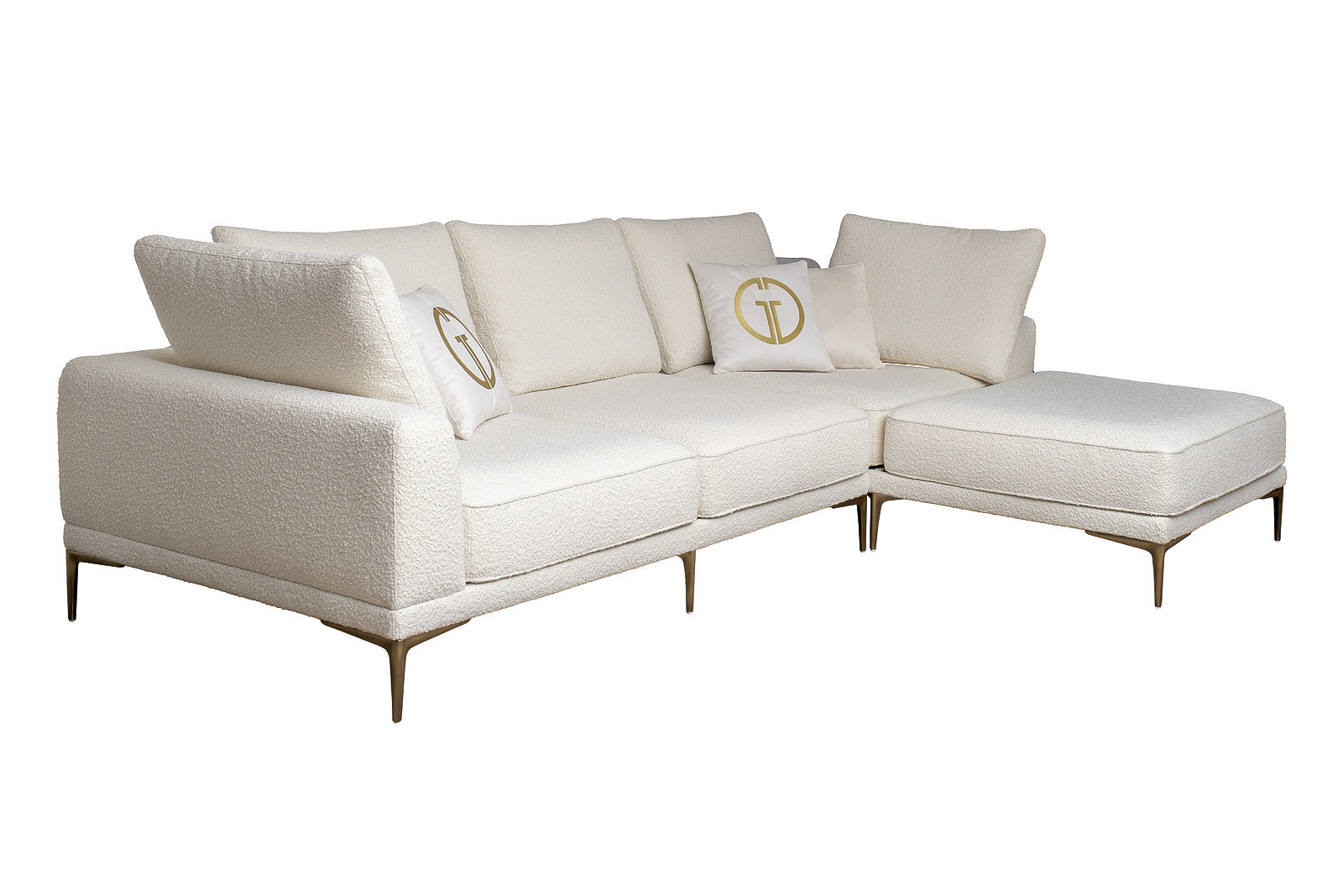 Комплект мебели №52 модульный Диван Тесоро(Tesoro) (правый угол). В состав комплекта входит: модуль угловой левый DL-1шт, модуль угловой правый KR+P- 1шт. Комплект выполнен в ткани из коллекции Garda Decor- букле Orso -. В состав комплекта входят декоративные подушки: 45*45см в ткани Атмосфера(Atmosphera)010-2шт, 45*45см в ткани Атмосфера(Atmosphera)000-2шт с вышивкой эмблема в цвет золото. Металлические опоры 18см, цвет бронза. Габариты комплекта: ширина- 3100мм, глубина-2000мм, высота- 900мм. Глубина сиденья- 750мм, высота посадочного места- 440мм.