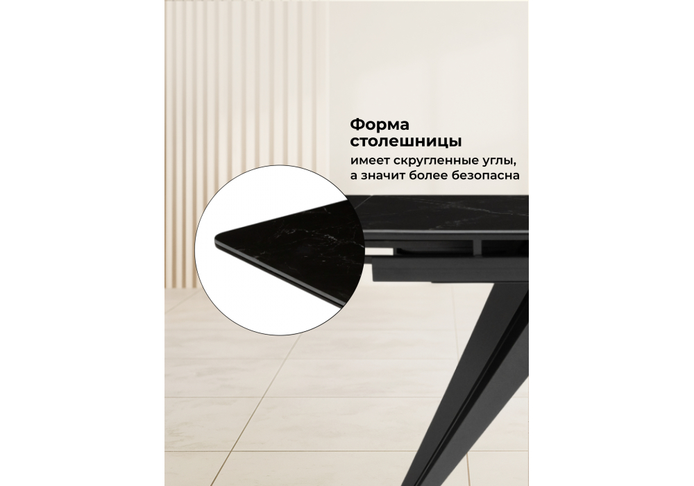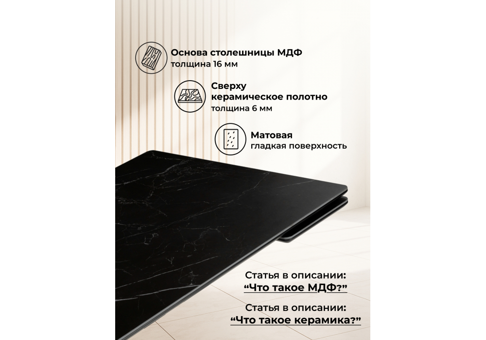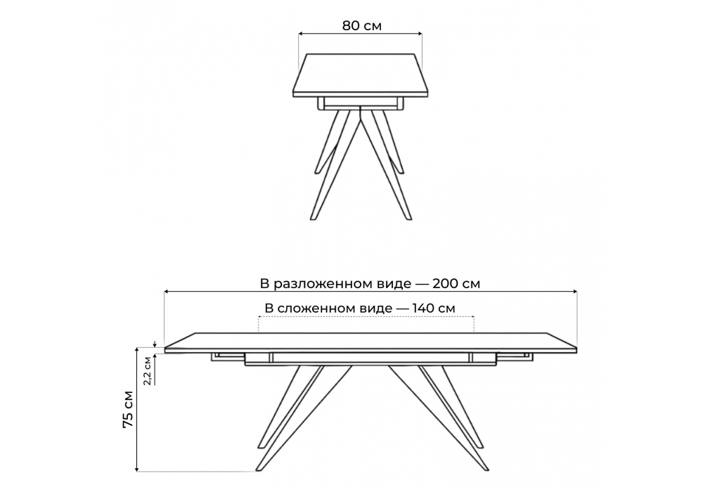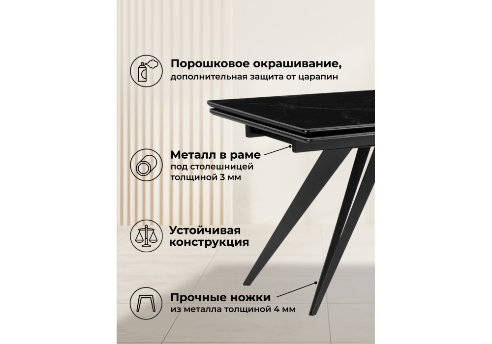 Материал каркаса - металл; Материал столешницы - Керамика; Цвет ножек - черный; Ширина - 80; Высота - 75; Длина стола в разложенном виде - 200; Длина - 140;
