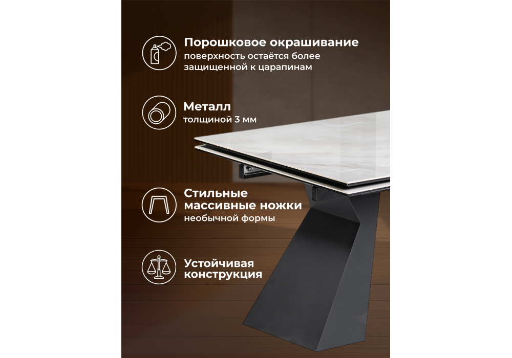 Толщина столешницы: 2 см. Материал каркаса - металл; Материал столешницы - Керамика; Ширина - 100; Высота - 75; Длина стола в разложенном виде - 290; Длина - 240;