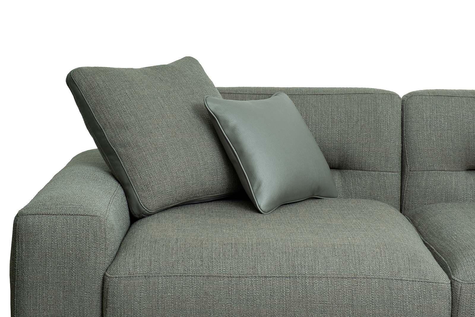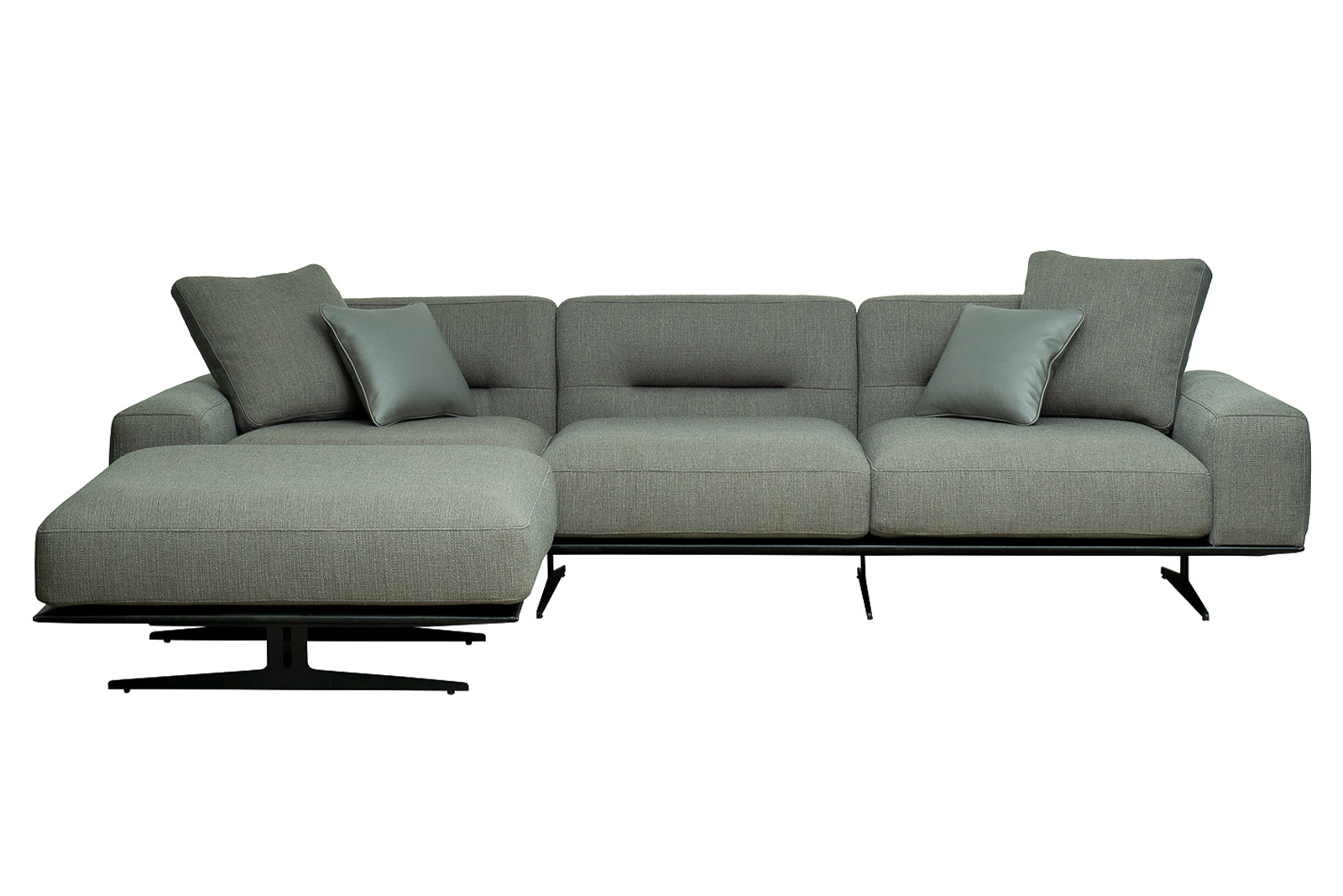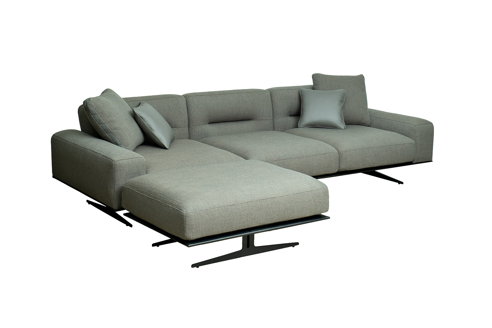 Комплект мебели №14 диван модульный PORTO (левый угол). В состав комплекта входит: основание трехместное-1шт, выполнена в иск.коже Magic01; подлокотник низкий-2шт; сиденье с высокой спинкой-3шт; отдельностоящий пуф- 1шт. Основная ткань комплекта- рогожка Norton Graphite из коллекции тканей Garda Decor. В сотав комплекта входят декоративные подушки: 50*50см с бурлетом 2шт- в ткани Norton Graphite, бурлет- иск.кожа Enzo697; 40*40см с кантом 2шт- в иск.коже Enzo 697. Металлические опоры- 170см, цвет черный. Габариты комплекта: ширина-294см, глубина- 194см, высота-75см. Глубина пуфа- 107см, глубина посадочного места- 82см, высота посадочного места- 45см