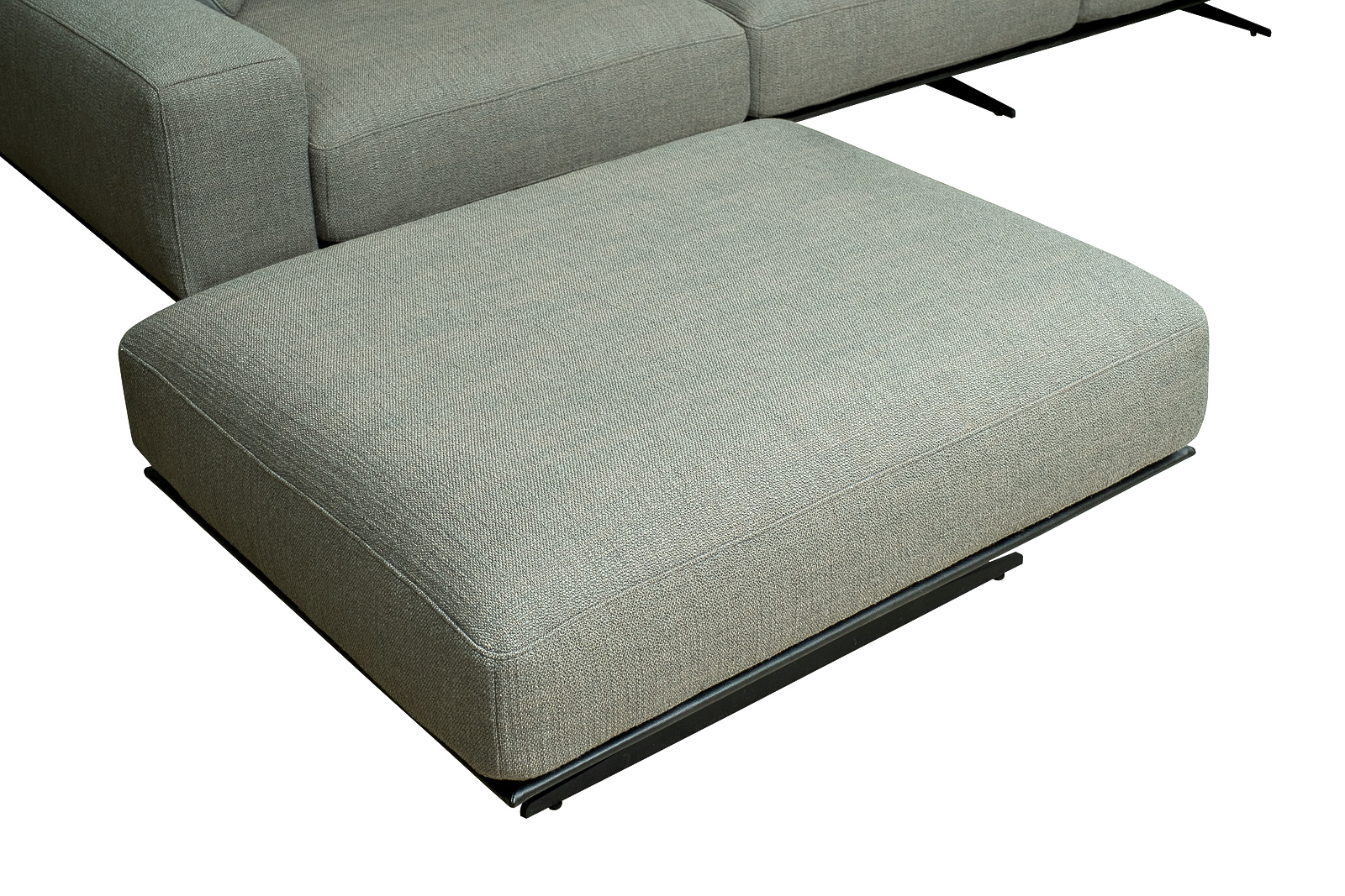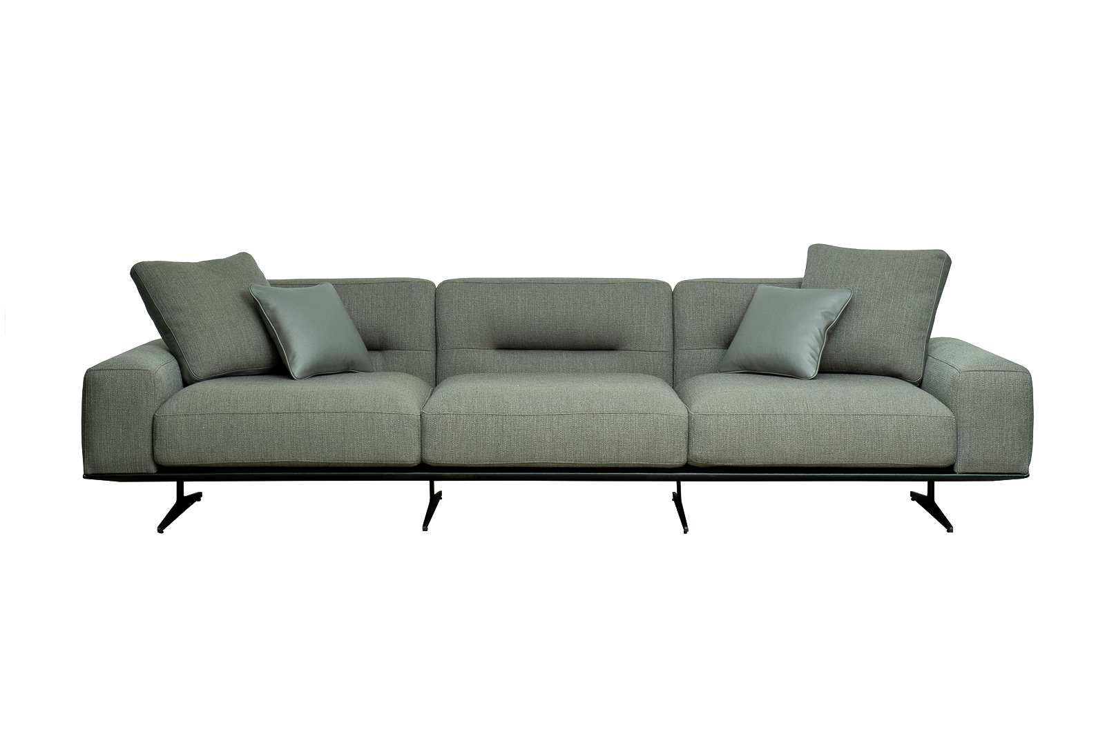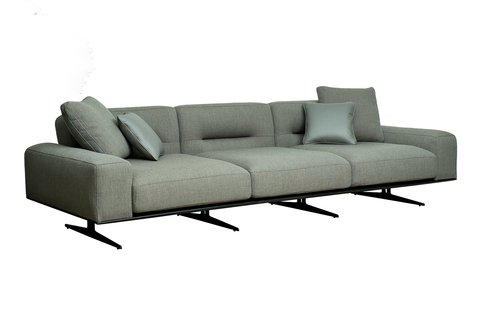 Комплект мебели №14 диван модульный PORTO (левый угол). В состав комплекта входит: основание трехместное-1шт, выполнена в иск.коже Magic01; подлокотник низкий-2шт; сиденье с высокой спинкой-3шт; отдельностоящий пуф- 1шт. Основная ткань комплекта- рогожка Norton Graphite из коллекции тканей Garda Decor. В сотав комплекта входят декоративные подушки: 50*50см с бурлетом 2шт- в ткани Norton Graphite, бурлет- иск.кожа Enzo697; 40*40см с кантом 2шт- в иск.коже Enzo 697. Металлические опоры- 170см, цвет черный. Габариты комплекта: ширина-294см, глубина- 194см, высота-75см. Глубина пуфа- 107см, глубина посадочного места- 82см, высота посадочного места- 45см