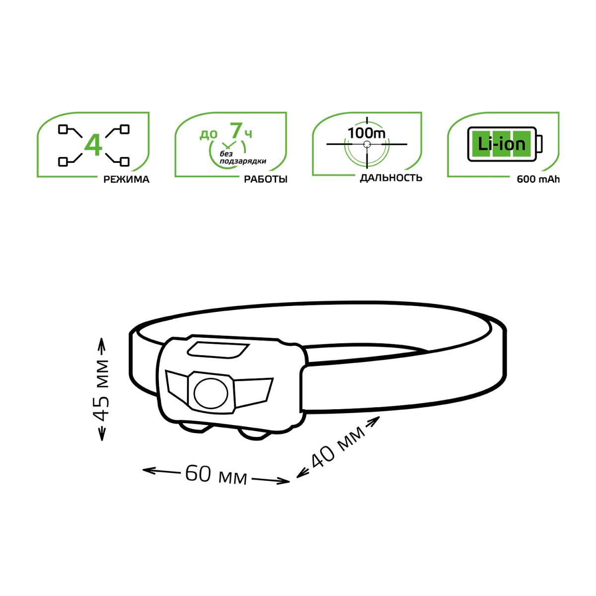 Налобный светодиодный фонарь Gauss аккумуляторный 40х60 130 лм GF405