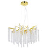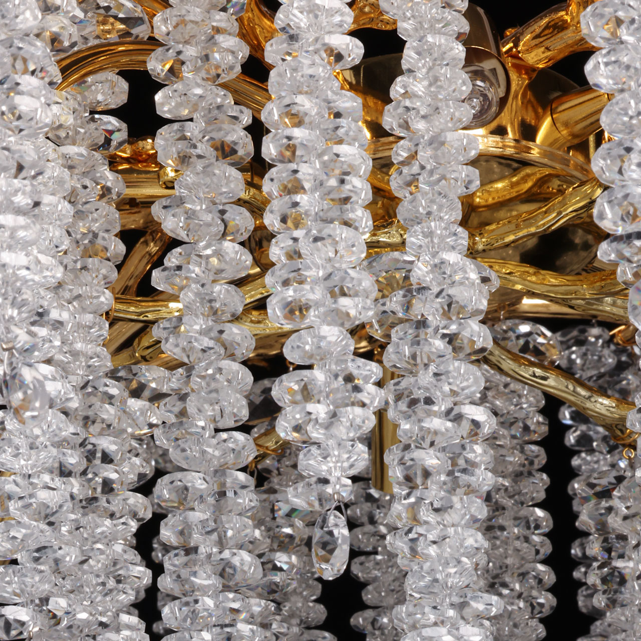 Основание подвесной люстры выполнено по технологии художественного литья из сплава алюминия с цинком и гальванизировано в цвет золота. Люстра декорирована гроздьями из прозрачного хрусталя. Потолочная чаша декорирована фактурной чеканкой.