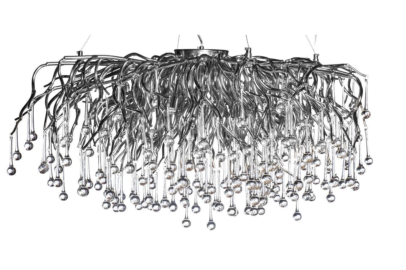 Роскошная эффектная необычная люстра продставляет собой каскад из сотен прозрачных стеклянных "капель", свисающих с металлических "веточек" цвета хром. Такая люстра формирует стиль комнаты, делает ее уникальной и особенной. Все предметы обстановки приобретают совершенно иное звучание, наполняется новым смыслом. Подвесы люстры можно закрепить ближе к потолку, либо спустить пониже, чтобы люстра свисала над обеденным или журнальным столом в столовой или гостиной. Интерьер приобретает богемный и артистичный вид в стилистике ар-деко. Рекомендуемая площадь освещения 30-40м2.