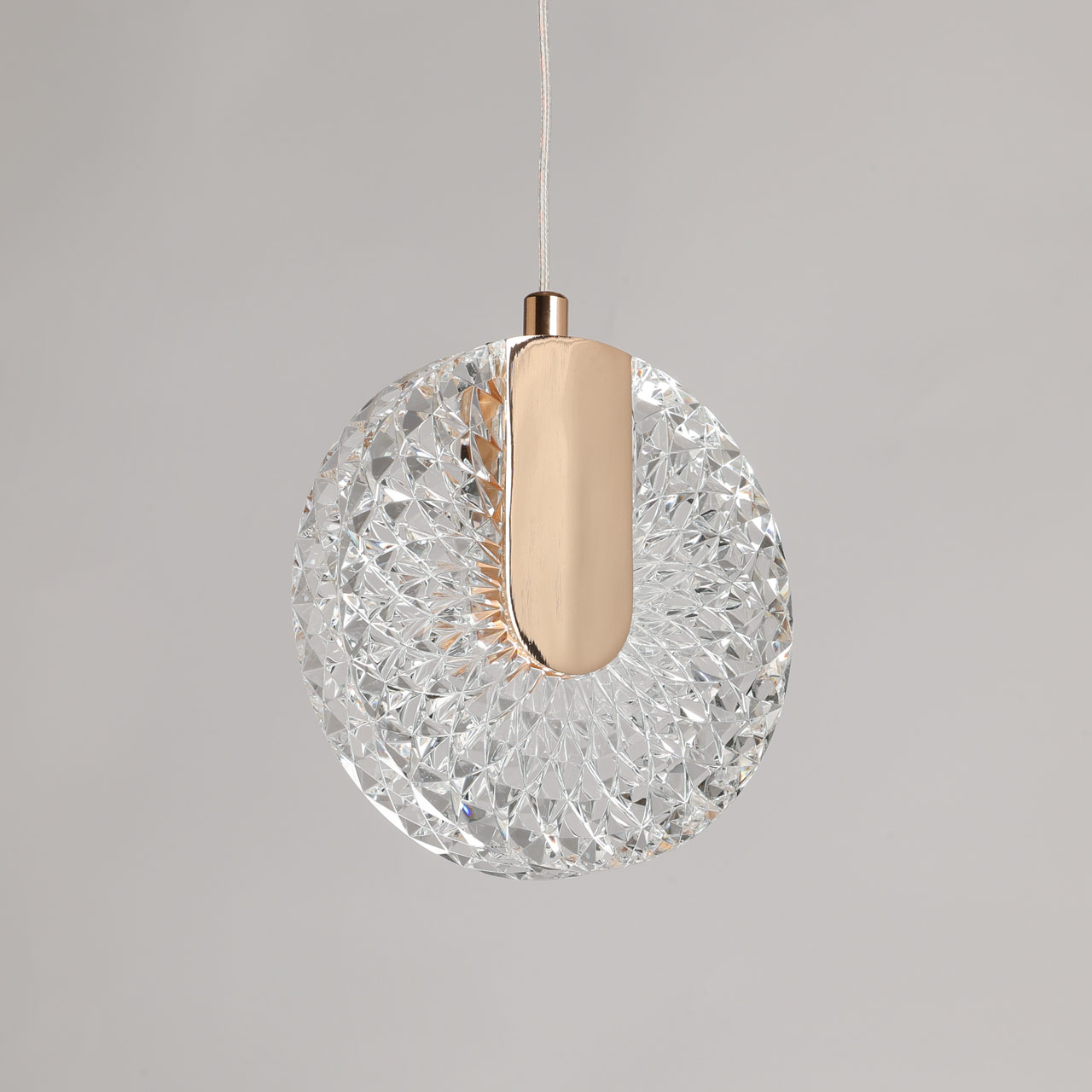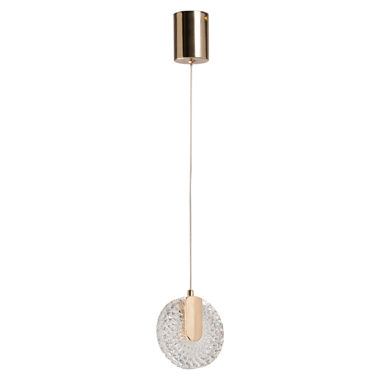Металлическая потолочная чаша подвеса гальванизирована в цвет французского золота. Корпус плафона в виде пластины выполнен из сплава алюминия с цинком и гальванизирован в цвет основания. Светодиодный источник света закрыт прозрачным фактурным акрилом.