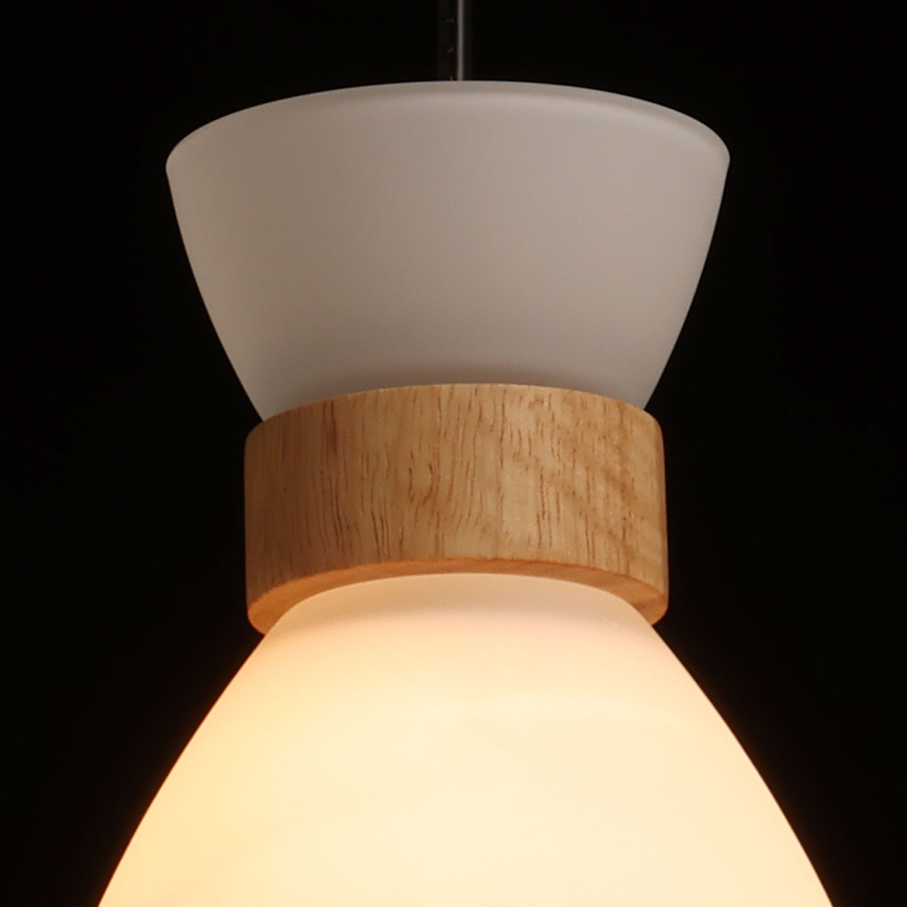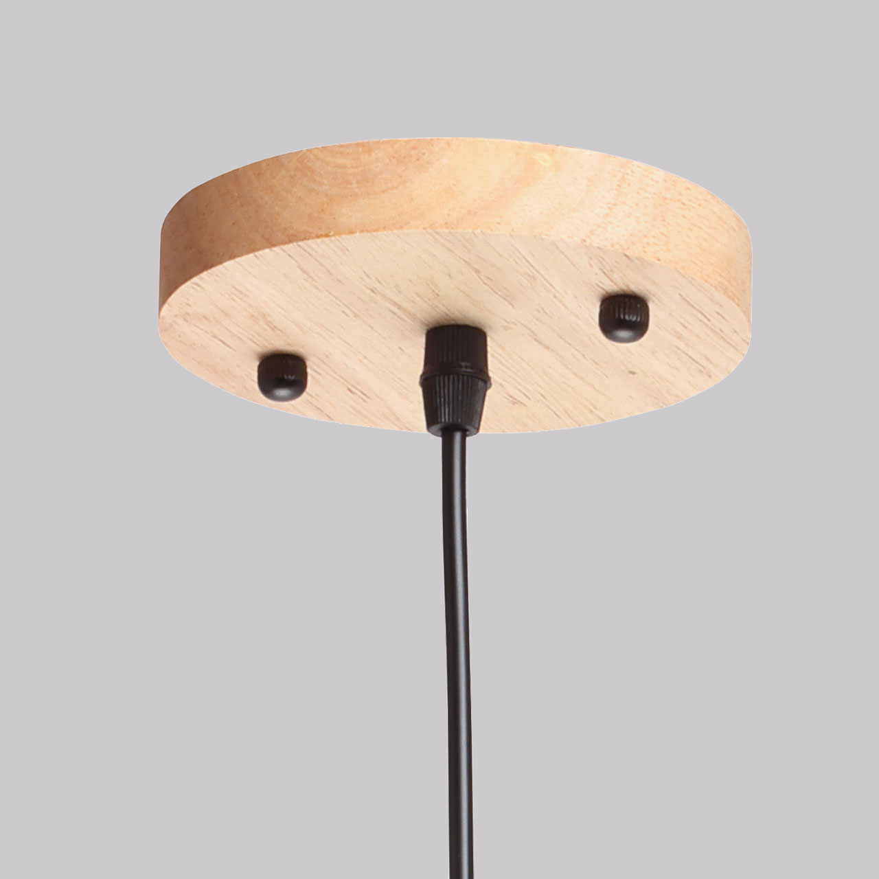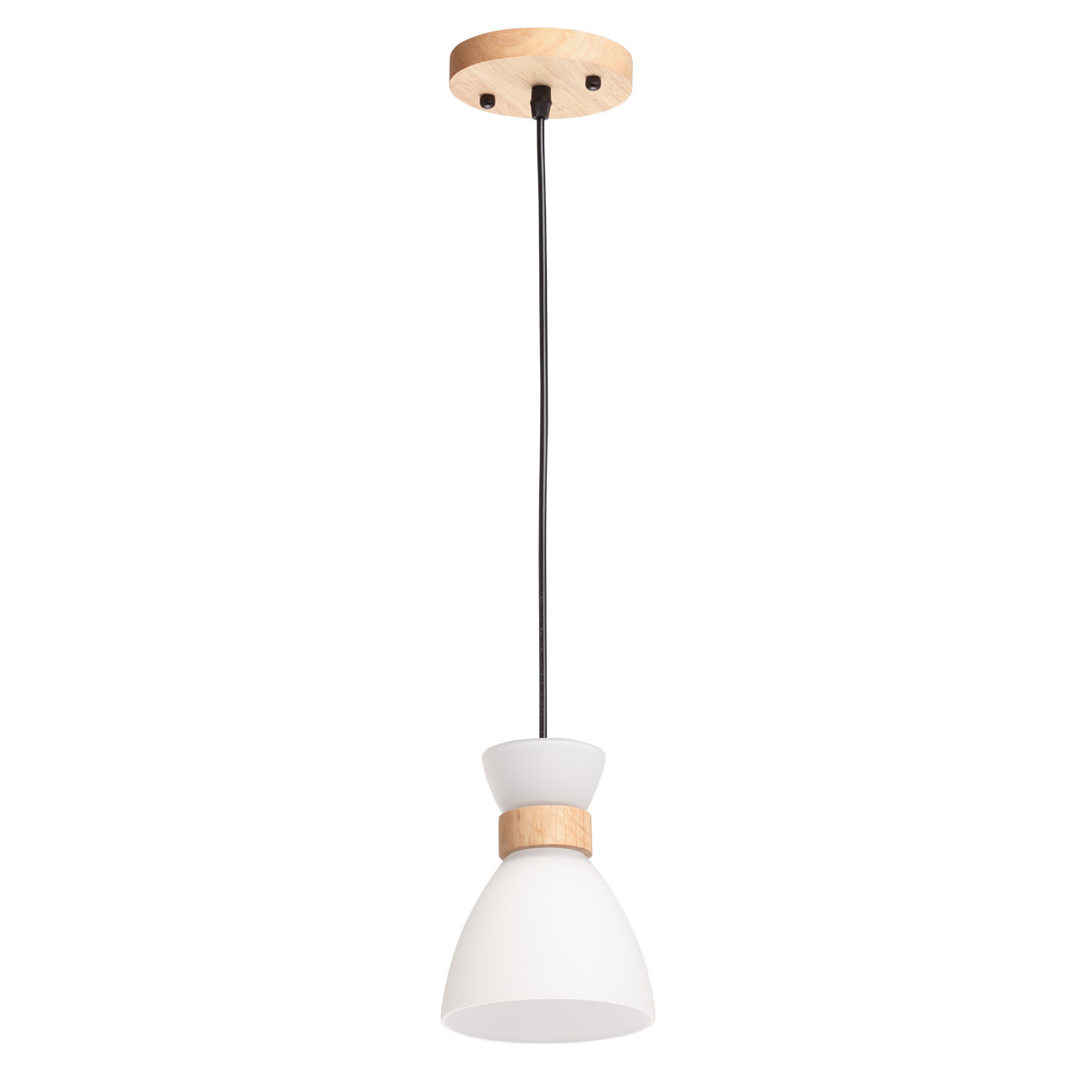 Основание подвеса выполнено из натурального дерева светлого цвета. Отдельные элементы основания выполнены из металла и окрашены в черный цвет. Стеклянный плафон с внутренней стороны окрашен в белый цвет. Подвес декорирован элементами из светлого натурального дерева.