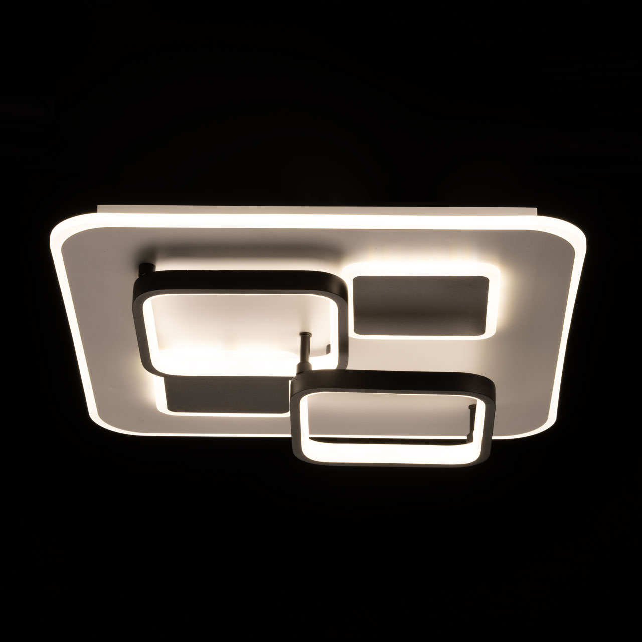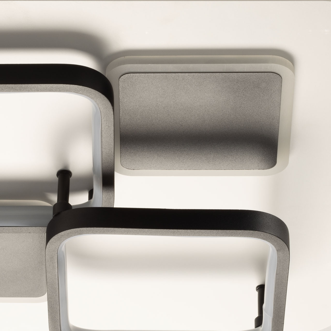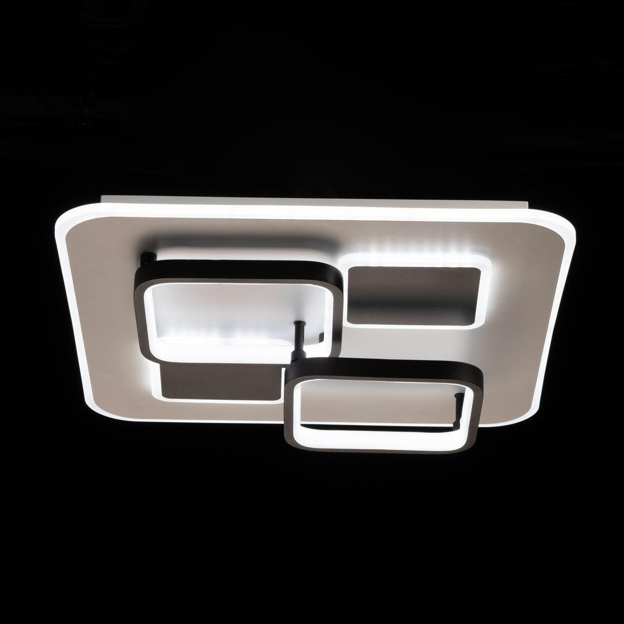 Металлическое основание потолочной люстры окрашено в белый цвет. Корпус плафона выполнен из сплава алюминия с цинком и окрашен в черный цвет. Светодиодные источники света закрыты матовым акрилом.