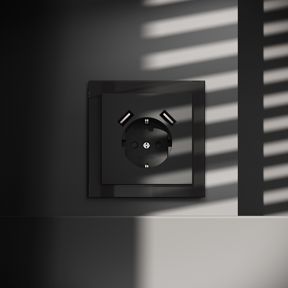 Купить "Розетка встраиваемая с заземлением и защитными шторками, 16А, с USB, A+A Voltum S70 VLS040408 (черный матовый"