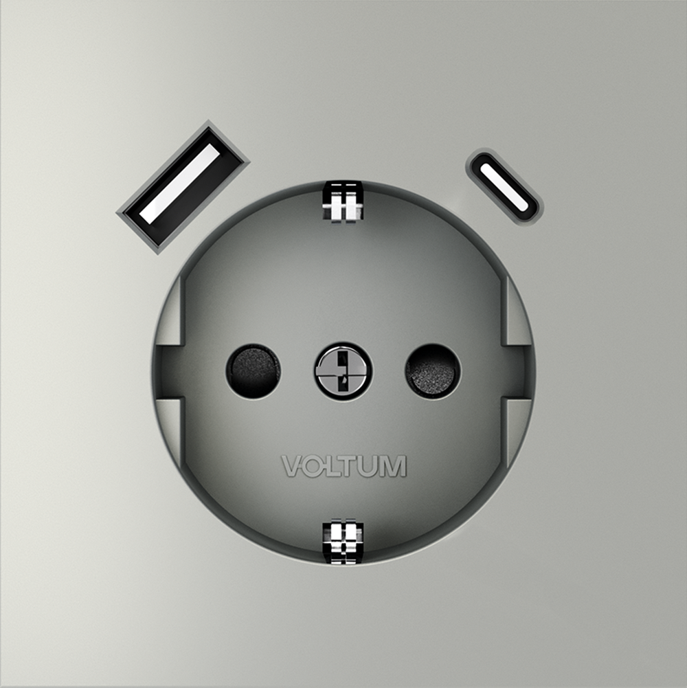 Купить "Розетка встраиваемая с заземлением и защитными шторками, 16А, с USB, A+С Voltum S70 VLS040505 (сталь)"