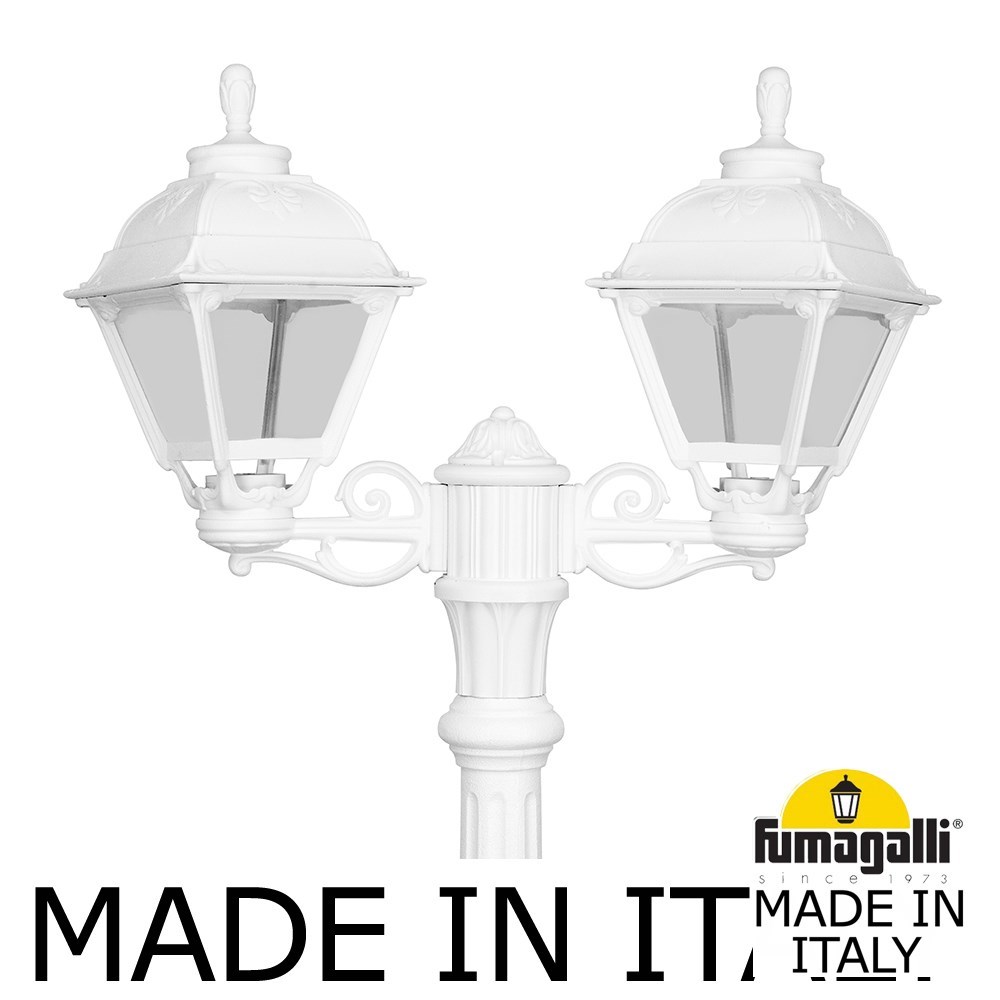 Садово-парковый фонарь FUMAGALLI серии CEFA, модель CEFA/GIGI/BISSO 2L. Парковый торшер, столб GIGI с двумя уличными фонарями CEFA на малых консолях BISSO. Используются для архитектурного и ландшафтного освещения в стиле "классика". Место установки столбиков освещения - парковые дорожки, cкверы, садовые участки, тротуары, а так же ландшафтные и архитектурные объекты. Изготовлены в Италии, по уникальным технологиям "FUMAGALLI" из современного композитного полимера RESIN. Этот материал в 5 раз прочнее металла, не ржавеет, не окисляется, не выгорает на солнце, его не нужно красить. Все светильники пыле-влаго защищены по стандарту IP55 (Пылезащищенные, защита от водяных струй с любого направления). В комплекте идут крепежи и закладные элементы. Рассеиватель выполнен из антивандального, не мутнеющего и не горючего PMMA (ПолиМетилМетаАкрилат). Срок службы светильника - не менее 20 лет. Температура использования от -60 до +90. В серии CEFA есть фонари в настенном (BISSO/CEFA, OFIR/CEFA, MIRRA/CEFA, PORPORA/CEFA) подвесном (SICHEM/CEFA) и наземном исполнении (MINILOT/CEFA, MIZAR.R/CEFA, IAFAET.R/CEFA, ALOE.R/CEFA, ARTU/CEFA, GIGI/CEFA, RICU/CEFA, RICU/ISSO/CEFA 2L, NEBO/CEFA, NEBO OFIR/CEFA 2L, NEBO OFIR/CEFA 3L) со столбами разной высоты, с разным количеством и конфигурацией голов. Консоли настенных фонарей и кронштейны светильников на столбах освщения могут устанавливаться вверх/вниз. Столбы выше 150 см имеют в основе мощную стальную трубу с двойной оцинковкой. При заказе требуется выбрать цвет корпуса, цвет плафона и тип патрона. По стилю и дизайну серия уличных светильников CEFA похожа на светильники большого размера SIMON и на светильники очень большого размера (Гранд) PIETRO. По размеру CEFA относится к средним светильникам как серия RUT, SALEM и GLOBE 300.
