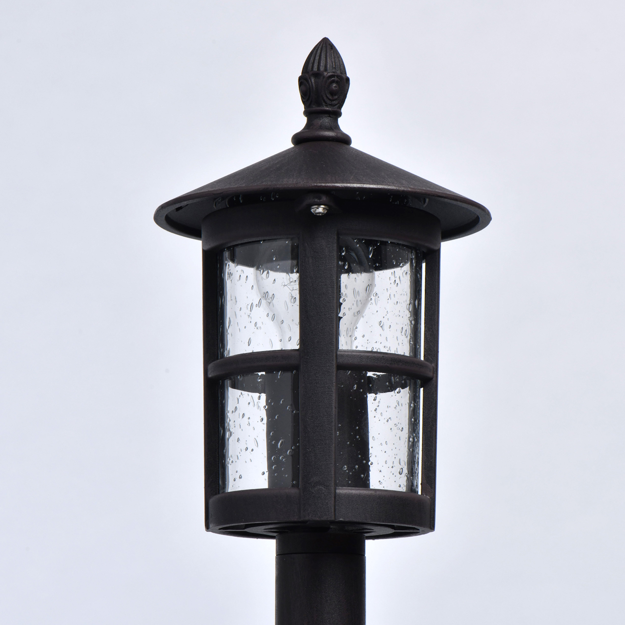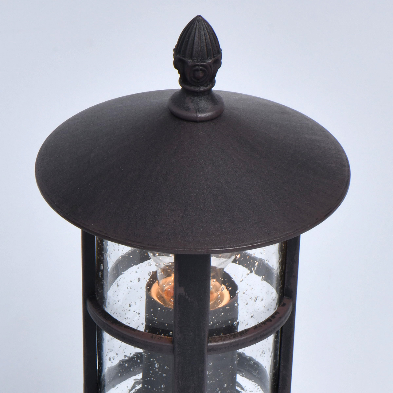 Основание светильника выполнено из сплава алюминия и обработано по технологии порошкового окрашивания в коричневый цвет с патинированием в цвет кофе. Плафон выполнен из прозрачного стекла с декоративной имитацией капель.