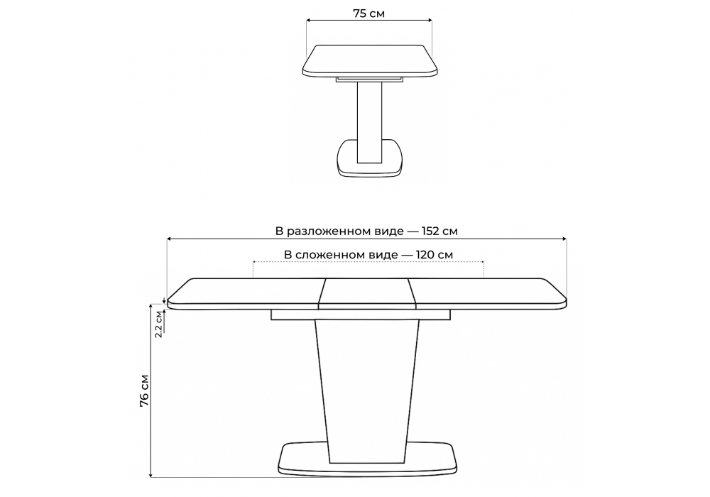 Толщина столешницы: 2,2 см. Материал каркаса - ЛДСП; Ширина - 75; Высота - 76; Длина стола в разложенном виде - 152; Длина - 120;