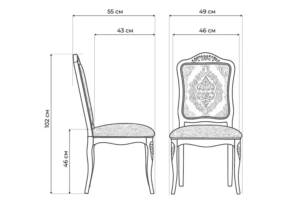 Материал каркаса - массив дерева; Материал сиденья - ткань; Материал обивки - ткань; Ширина - 49; Глубина - 55; Высота - 102; Ширина сиденья - 46; Глубина сиденья - 43; Высота сиденья - 46;