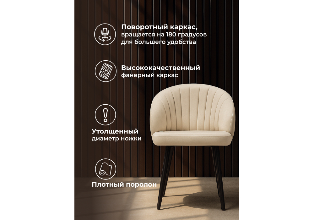 Этот стильный стул сочетает в себе тактильно приятный велюр, уютное сиденье с функцией вращения и исключительную устойчивость. Идеальное решение для обеденной зоны, где важны уют, долговечность и возможность легко менять положение.