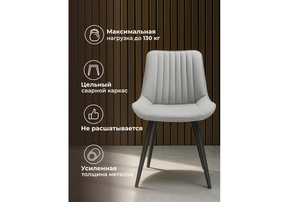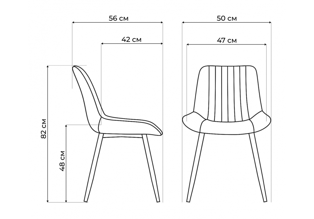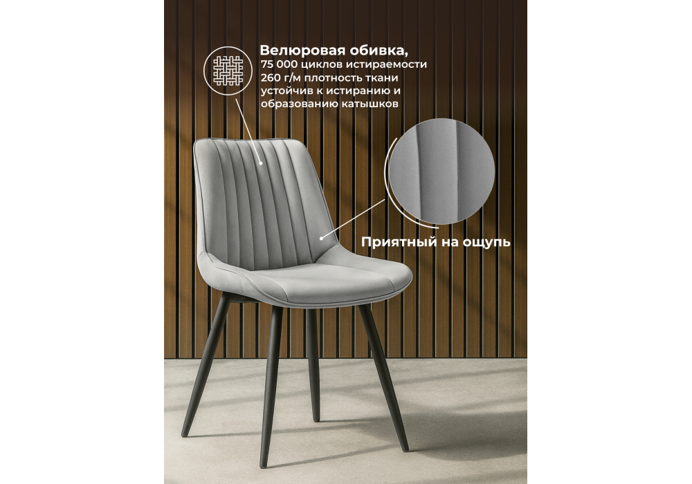 Материал каркаса - металл; Материал сиденья - велюр; Материал обивки - велюр; Цвет ножек - черный; Ширина - 50,5; Глубина - 57; Высота - 83; Ширина сиденья - 47; Глубина сиденья - 41; Высота сиденья - 48;