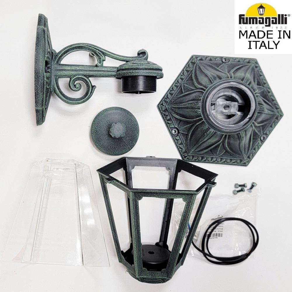 Светильники уличные настенные FUMAGALLI серии ANNA, модель ANNA/BISSO. Консольный уличный светильник для монтажа на стену. Настенный кронштейн BISSO малого размера и светильник ANNA. Используются для фасадного и архитектурного освещения в стиле "классика". Место установки уличных светильников - фасады, колонны и другие вертикальные поверхности исторических зданий, котеджей, загородных домов, церквей, а так же, другие места где требуется и возможна установка фонарей. Изготовлены в Италии, по уникальным технологиям "FUMAGALLI" из современного композитного полимера RESIN. Этот материал в 5 раз прочнее металла, не ржавеет, не окисляется, не выгорает на солнце, его не нужно красить. Все светильники пыле-влаго защищены по стандарту IP55 (защита от пыли, защита от струй воды, падающих под любым углом). Рассеиватель выполнен из антивандального, не мутнеющего и не горючего PMMA (ПолиМетилМетаАкрилат). Срок службы светильника - не менее 20 лет. Температура использования от -60 до +90. В серии ANNA есть фонари в настенном (BISSO/ANNA, PORPORA/ANNA) подвесном (SICHEM/ANNA, SICHEM/ANNA 3L) и наземном исполнении (IAFAET.R/ANNA, ALOE.R/ANNA, ARTU/ANNA, GIGI/ANNA, RICU/ANNA, RICU/ISSO/ANNA 1L, RICU/ISSO/ANNA 2L, RICU/ISSO/ANNA 3L) со столбами разной высоты, с разным количеством и конфигурацией голов. Консоли настенных фонарей и кронштейны светильников на столбах освщения могут устанавливаться вверх/вниз. Столбы выше 150 см имеют в основе мощную стальную трубу с двойной оцинковкой. При заказе требуется выбрать цвет корпуса, цвет плафона и тип патрона. Возможен светодиодный вариант с LED цоколем GX-53. По стилю и дизайну серия уличных светильников ANNA похожа на светильники среднего размера серии RUT и на светильники большого размера серии NOEMI. По размеру ANNA относится к малым светильникам как серия SABA и GLOBE 250.