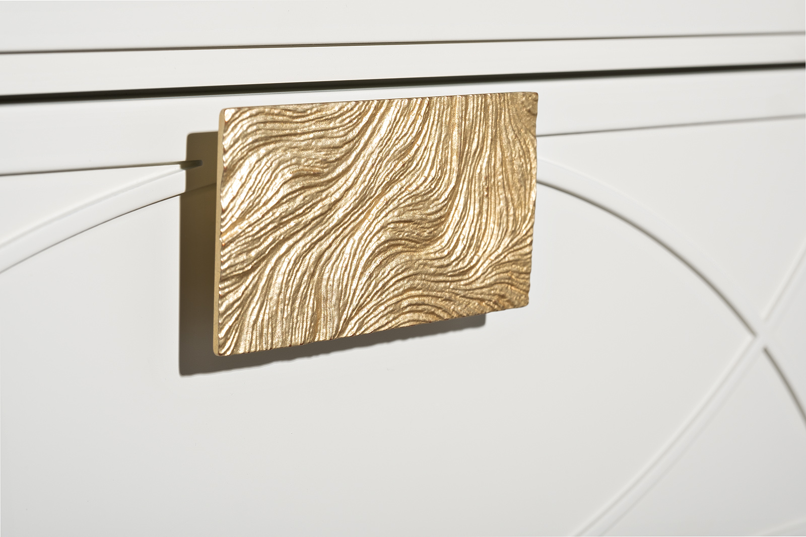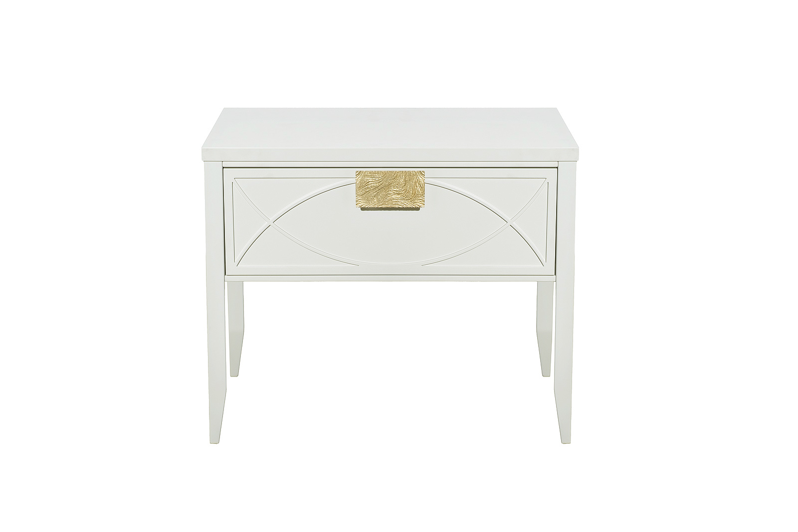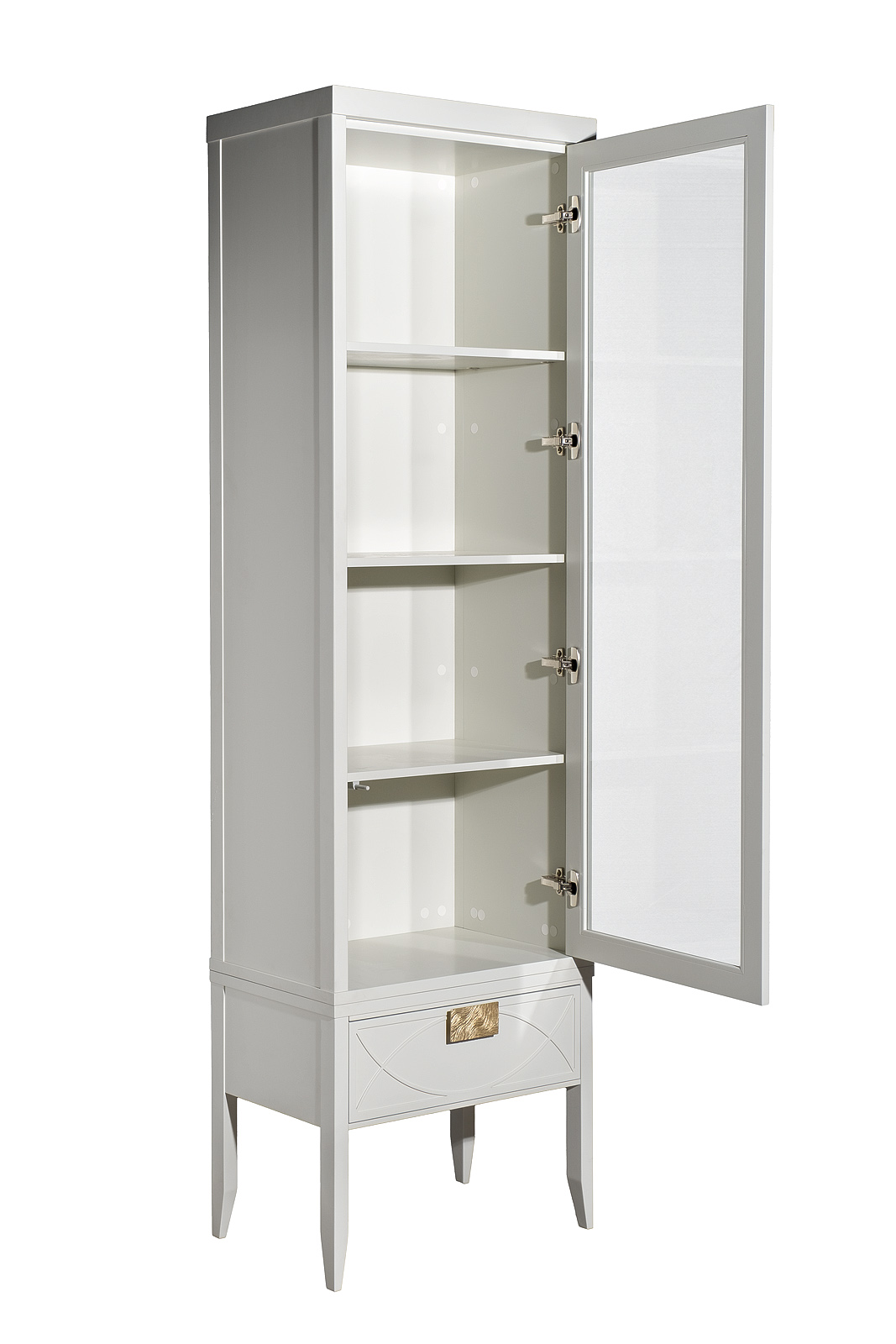 Дизайнерская тумбочка в стиле ар-деко - авторская разработка студии Garda Decor. Бежевый матовый фасад украшен объемным дугообразным декором и широкими рельефными ручками золотого цвета (матовое золото). Выдвижной ящик прекрасно подойдет для домашней аптечки, хранения белья, щеток, косметики и прочих мелочей. На просторной столешнице будет прекрасно выглядеть одна из настольных ламп в стилистике ар-деко, ассортимент которых широко представлен на нашем сайте. Тонкие ножки придают конструкции легкость и изящество. Эксклюзивная тумбочка станет гармоничным дополнением интерьера спальни, гостиной или прихожей. На фото на сайте тумба прикроватная с 1-м ящиком представлена в комплектации с двумя видами шкафов-витрин: арт.151SV-000017(шкаф-витрина открытый узкий), арт.151SV-000015(шкаф-витрина с 1-м стеклянным фасадом). Тумба прикроватная и витрины скрепляются между собой саморезами(в комплекте).