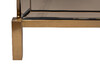 Прикроватная тумбочка под золото добавит нотку аристократизма и изысканной элегантности в обстановку спальни, будуара или гостиной. Особенность данной модели – отделка из зеркала и нержавеющей стали. Дизайнерская тумбочка с двумя ящиками составит стильную компанию кровати, прекрасно впишется в интерьерную стилистику ар-деко, неоклассика, фьюжн. Материалы: зеркало матовое, МДФ, нерж. сталь золото матовое